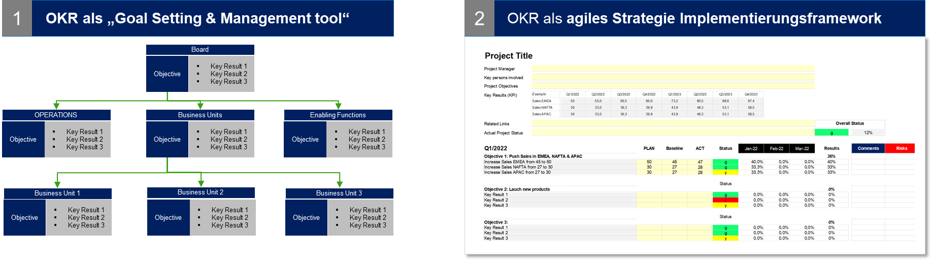 OKRs sind eine Methode, um sehr fokussiert an der individuellen oder Team-Zielerreichung zu arbeiten und diese Zielerreichung agil, d.h. in relativ kurzen Zeitabständen zu überprüfen und iterativ anzupassen. OKRs können im Rahmen der individuellen Zielerreichung für einzelne Mitarbeiter oder auch für strategische Projekte erstellt werden. In diesem Fall sind die OKRs ein zusätzliches Instrument als Brücke zwischen Strategie und operativer Projektumsetzung mit dem Ziel der konsequenten Priorisierung und Fokussierung auf die Zielerreichung. Weiter zu: OKR