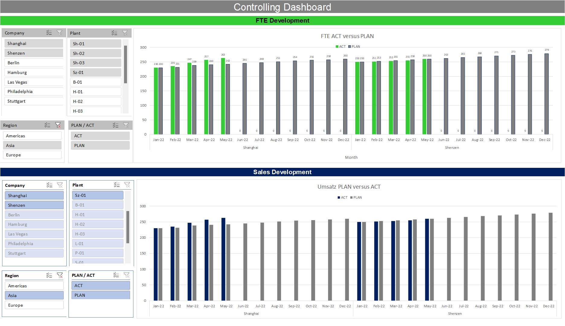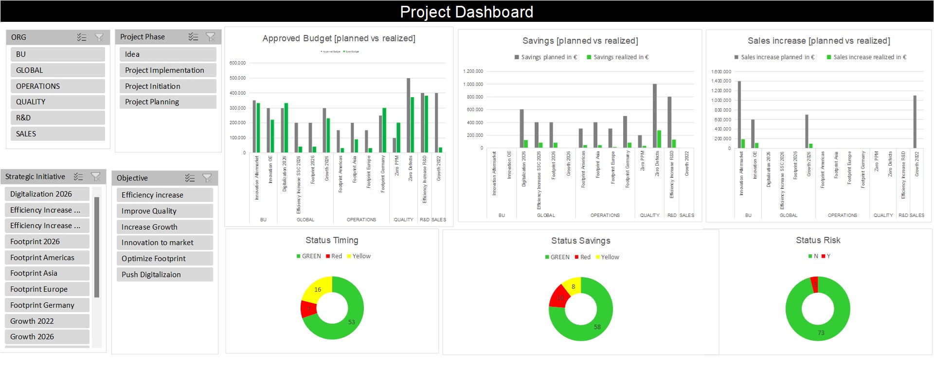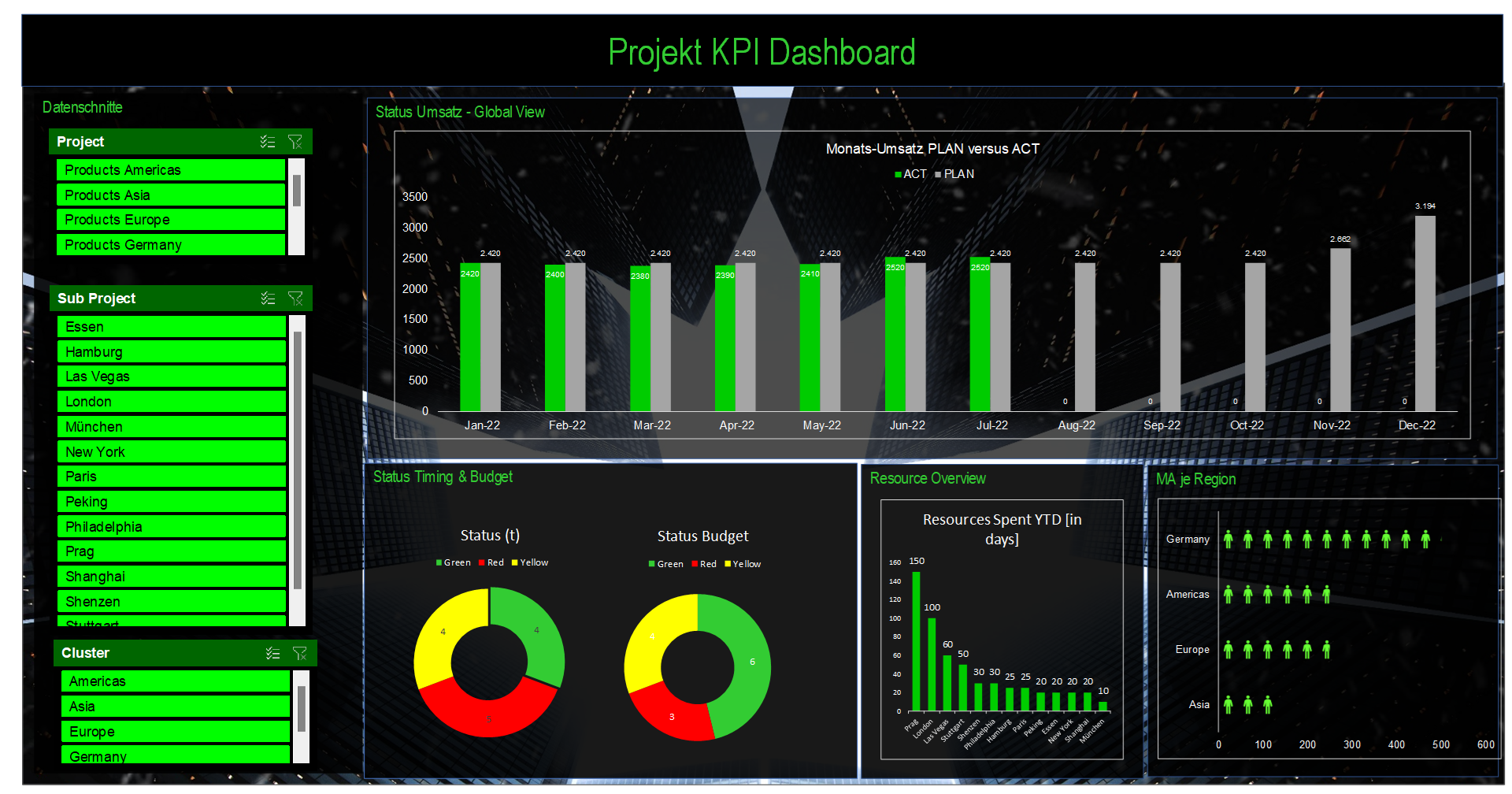 Das monatliche Monitoring der Zielerreichung ist wesentlich für ein erfolgreiches Projektmanagement. Die Zielerreichung kann sich jedoch auf sehr viele unterschiedliche KPIs beziehen. Insbesondere bei Großprojekten mit mehreren Sub-Projekten ist eine Visualisierung der Projektergebnisse sinnvoll, um eine schnelle Übersicht zu ermöglichen. Datenschnitte eignen sich für interaktive Dashboards. Sie müssen zunächst für ein Pivotchart erstellt und dann ebenfalls den anderen Charts zugeordnet werden. Wichtig ist, dass sich die Pivot-Charts jeweils auf dieselbe Datenbasis beziehen. Wer ein Dashboard nicht ganz so langweilig gestalten möchte, kann ein Bild hinterlegen und die darüberliegende Oberfläche mit einer Transparenz von 10%-30% gestalten, so dass das Bild leicht durchschimmert.