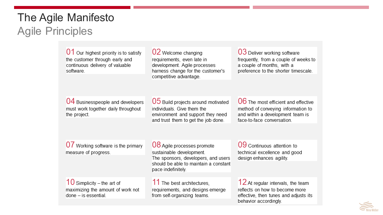 Das Agile Manifest wird durch die 12 Agilen Prinzipien ergänzt. Diese agilen Prinzipien können bei der Entwicklung einer für das Unternehmen passenden agilen Unternehmens- und Führungskultur unterstützen. Auch bei der Einführung agiler Projektmanagement-Methoden bilden diese Prinzipien ein wichtiges Fundament.