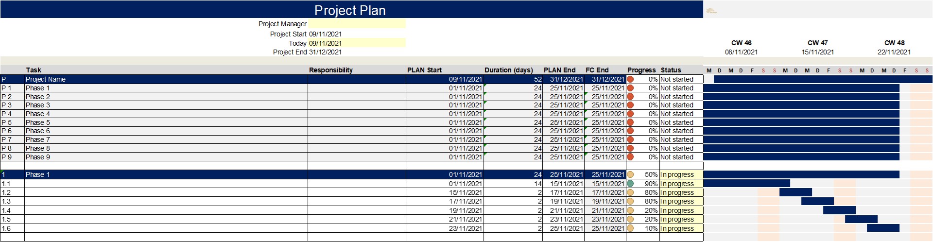 5 I Projekt Plan: Es gibt eine Vielzahl von Projektmanagement Software Lösungen, mit denen Gantt-Charts generiert werden können. Weit verbreitet sind Microsoft Project, Agannty, Asana oder monday.com. Wenn keine Software Lösung im Einsatz ist, kann auch ein entsprechender Projektplan in Excel erstellt werden. Wichtig ist hier die übersichtliche Planung der einzelnen WBS (Work Breakdown Structure). Neben den Plan-Start und Plan-End Daten sollte ein Forecast vorhanden sein, so dass Abweichungen zum Plan sofort erkennbar sind. Ebenfalls nicht fehlen sollte der Erfüllungsgrad (Degree of Implementation) oder Fortschritt in % zu jedem Arbeitspaket, um anzuzeigen, ob der inhaltliche Fortschritt zum Zeitverlauf passt, sowie eine Ampelfunktion. Bei Großprojekte empfiehlt sich eine Projektplanung je Sub Projekt oder Modul.