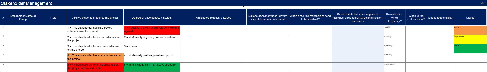6 I Stakeholder Management: Gerade bei Großprojekten ist die angemessene Einbindung der Stakeholder wichtig für die erfolgreiche Implementierung des Projektes. Hierzu werden die Stakeholder oder Stakeholder-Gruppen zunächst identifiziert. Wichtig ist, dass die Stakeholder vom gesamten Projektteam identifiziert werden. Zum einen hat das cross-funktionale Projektteam eine breitere Übersicht über die relevanten Stakeholder, zum anderen kann das Projektteam die Motivationen, Erwartungen und Reaktionen der Stakeholder in Bezug auf das Projekt besser einschätzen, da es meistens mindestens eine Person im Team gibt, die den jeweiligen Stakeholder besser kennt und seine Motivation in Bezug auf das Projekt einschätzen kann. Das Team identifiziert zunächst die Stakeholder, analysiert dann deren Einfluss auf das Projekt (von "little influence" bis "without his/her support, the project can fail"), sein/ihr Interesse an dem Projekt (von "negative" bis "active supporter"). Das Team antizipiert die Reaktionen und "pain points" der Stakeholder und ihre Erwartungen an die Einbindung in das Projekt. Schließlich definiert das Projektteam ganz konkrete und terminierte Maßnahmen zu Kommunikation und Einbindung jedes Stakeholders in das Projekt, inklusive eines Verantwortlichen. Die Status der Stakeholder Management Maßnahmen wird in diesem Template regelmäßig getrackt. Es ist Bestandteil der Projektmanagement Dokumente, die in regelmäßigen Abständen in Team Meetings reviewed werden.