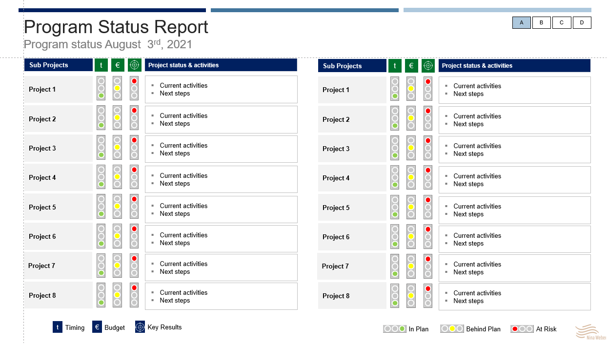 7a_Programm Report Overview: In den meisten Fällen ist ein Großprojekt eine Initiative oder ein Programm mit mehreren (Sub-) Projekten. Um hier zunächst einen transparenten Überblick über den Status der in dem Programm aktiven (Sub-) Projekte zu geben, ist ein Dashboard / Overview sinnvoll, in dem der Status der einzelnen (Sub-) Projekte hinsichtlich Zeitplanung, Budget und Zielerreichung sowie aktuelle Aktivitäten und "next steps" kurz und übersichtlich dargestellt werden. Eine solche Übersicht eignet sich als Einstieg zu einer Steuerkreis- oder Gremienpräsentation.