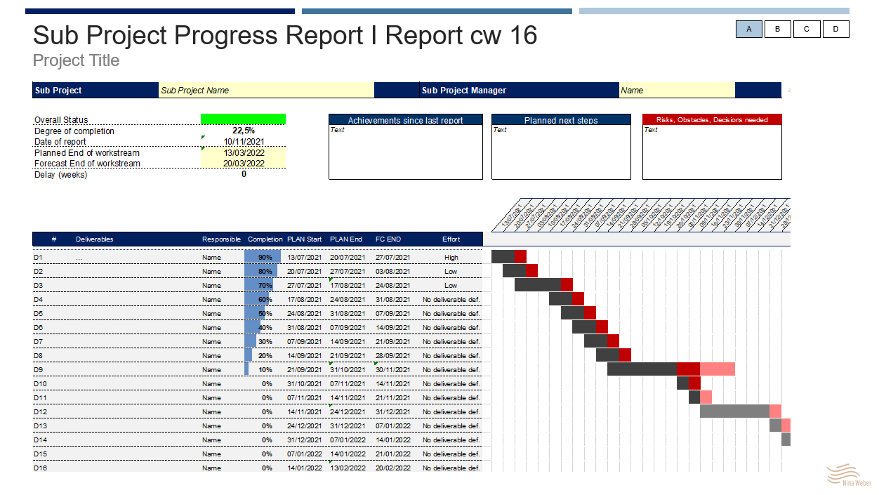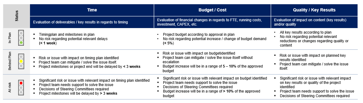 Gerade bei Großprojekten gibt es hier kein "one size fits all" und in den meisten Fällen sind unterschiedliche Statusreports abhängig von der Zielgruppe geeignet. Zu differenzieren ist hier zum einen der Unterschied zwischen Projekt und Programm. Zum anderen ist die Zielgruppe des Reports und das damit verfolgte Ziel zu beachten. Für eine high-level Gremienpräsentationen kann eine sehr stark vereinfachte Übersicht über den Projekt- oder Programmstatus als "one-pager" ausreichend sein. Auf der Arbeitsebene werden zur Steuerung des Projektes detailliertere Reports benötigt. Diese können sich zum einen auf die Abarbeitung der Arbeitspakete und zum anderen auf den Zielerreichungsgrad der geplanten KPIs beziehen.