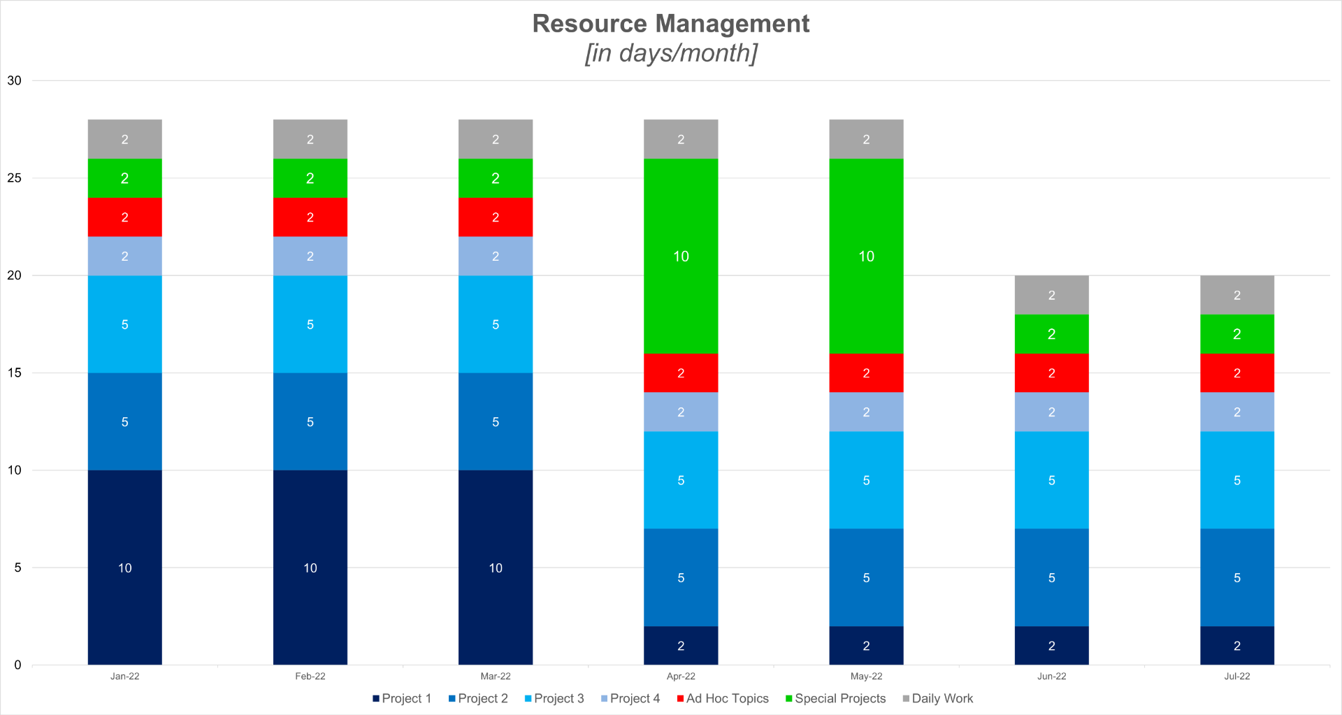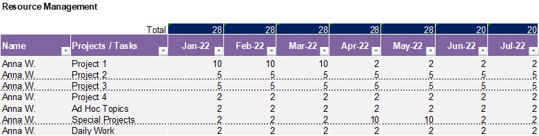 8 I Ressourcen Management: Ein wesentlicher Grund, warum Projekte scheitern, ist oft ein fehlendes Ressourcen Management. Personen werden Projekten zugeteilt, ohne die verfügbare Kapazität zu prüfen. Dies passiert sehr häufig in Fachbereichen, die ihre Stunden nicht auf Projekte schreiben müssen. In vielen Unternehmen ist die IT Abteilung eine der wenigen Fachbereiche, die Stunden auf Projekte oder Innenaufträge zurückmelden und somit Transparenz über ihren Ressourcenverbrauch haben. Es gibt eine Vielzahl von Software Lösungen, insbesondere im Bereich Projekt & Programm / Portfolio Management, die software-gestütztes Ressourcen Management anbieten. Ist eine solche Software nicht im Einsatz, so ist es die Aufgabe des Vorgesetzten, die Ressourcenplanung seines Teams zu steuern. Dies kann für eine erste Kapazitätenplanung sehr einfach gemacht werden, indem der Ressourcenbedarf je Mitarbeitet und Aufgabe je Monat grob eingeplant wird. Wichtig ist, dass neben der Kapazitätsplanung auch der Kapazitätsbedarf für "daily work", "ad hoc topics" oder auch "special projects" eingeplant wird. Sofern eine Überlastung erkennbar ist, muss die Ressourcenplanung differenzierter untersucht werden. Eine erste Abschätzung kann jedoch sehr schlank gehalten werden. In u.a. Beispiel wird deutlich, dass Anna W. erst im Juni 2022 mit ihrer Kapazität wieder im Normbereich ist. Zuvor ist sie insbesondere durch Projekt 1 im Jan-März und durch das Special Projekt im April/Mai überbucht.