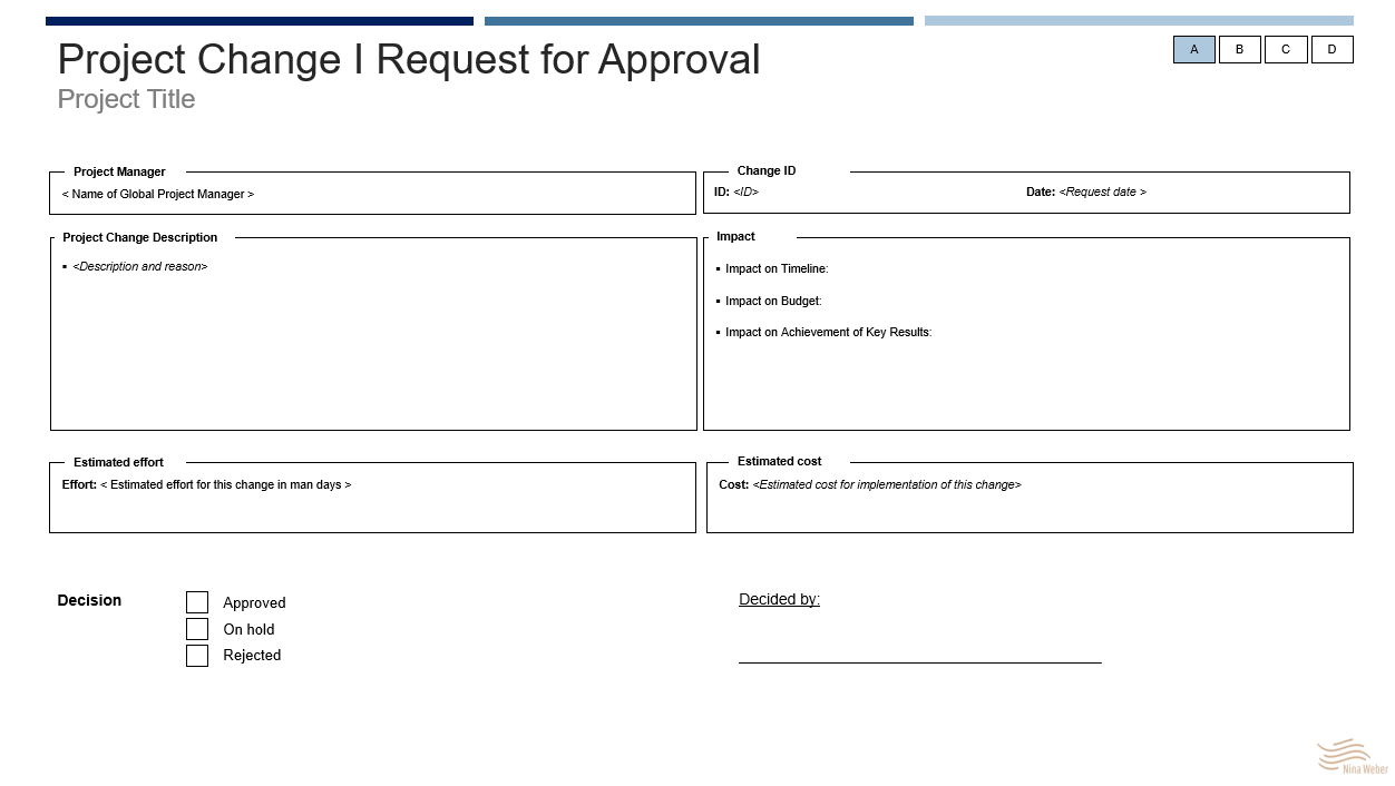 10 I Projekt Change Management (techn.): Wer kennt das nicht: Ein Projekt zieht sich über 2 Jahre und am Ende wundert man sich, dass etwas ganz anderes bei dem Projekt herausgekommen ist, als ursprünglich mal angedacht war. Wenn euch das bekannt vorkommt, dann ist das wahrscheinlich bei Projekten geschehen, deren scope sich schleichend reduziert hat - ohne die Reduzierung des scopes transparent freizugeben. Eine schleichende Änderung des scopes geschieht jedoch in beide Richtungen: Reduzierung und Erhöhung. Beide Änderungen dürfen nicht schleichend und intransparent eingeführt werden, sondern sollten von den relevanten Entscheidern freigegeben werden. Sofern ein Projektmanagement-System im Einsatz ist, geschieht das meistens per Workflow, in dem die geänderte Timeline oder der geänderte Budgetbedarf offiziell freigegeben und somit dokumentiert ist. Sofern kein Projektmanagement System im Einsatz ist, muss dies manuell erfolgen und trotzdem strukturiert dokumentiert erfolgen. Hierbei hilft ein Change Request Approval Template.