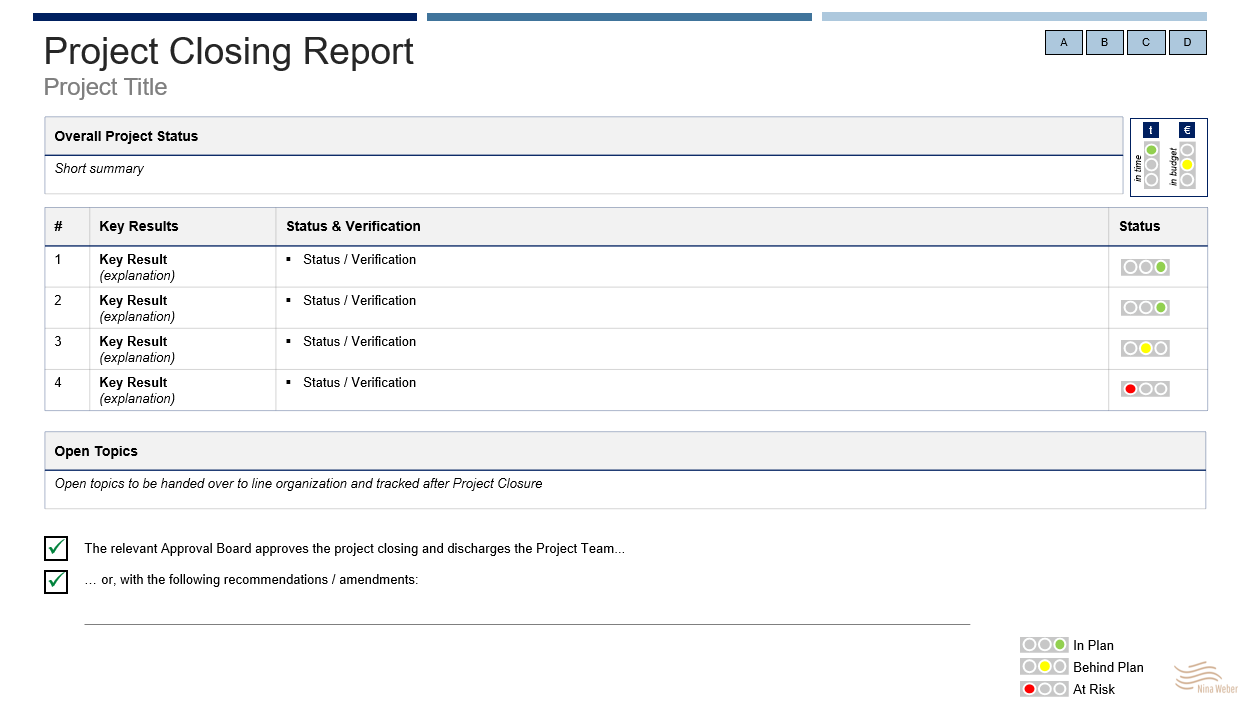 Hier wird das Gesamtprojekt hinsichtlich Timing und Budget bewertet. Die geplanten Projektergebnisse (Key Results) werden den tatsächlich erzielten Resultaten gegenüber gestellt. Sofern ein Projektziel nicht erreicht wird, muss eine Erläuterung angegeben werden. Offene Punkte, die an die Linienorganisation übergeben werden, werden ebenfalls dokumentiert. Schließlich wird dokumentiert, ob das Entscheidungsgremium das Projektteam entlastet und das Projekt geschlossen werden kann.