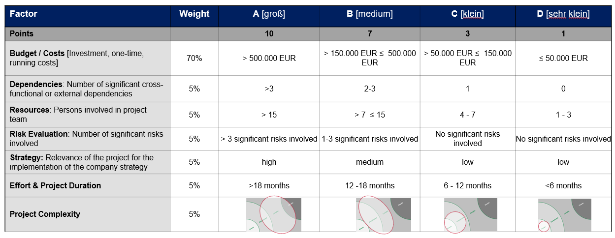Es gibt bestimmte Faktoren, die zur Bestimmung der Projektkategorien gebräuchlich sind. Dies sind Budgetbedarf, Grad der Abhängigkeiten, Ressourcenbedarf, Projektrisiken, Bedeutung für die Umsetzung der Unternehmensstrategie, Projektdauer und Projektkomplexität. Die Grenzwerte sind unternehmensindividuell anzupassen. Das Beispiel in dem unteren Bild eignet sich für kleinere und mittelständische Unternehmen (KMU).