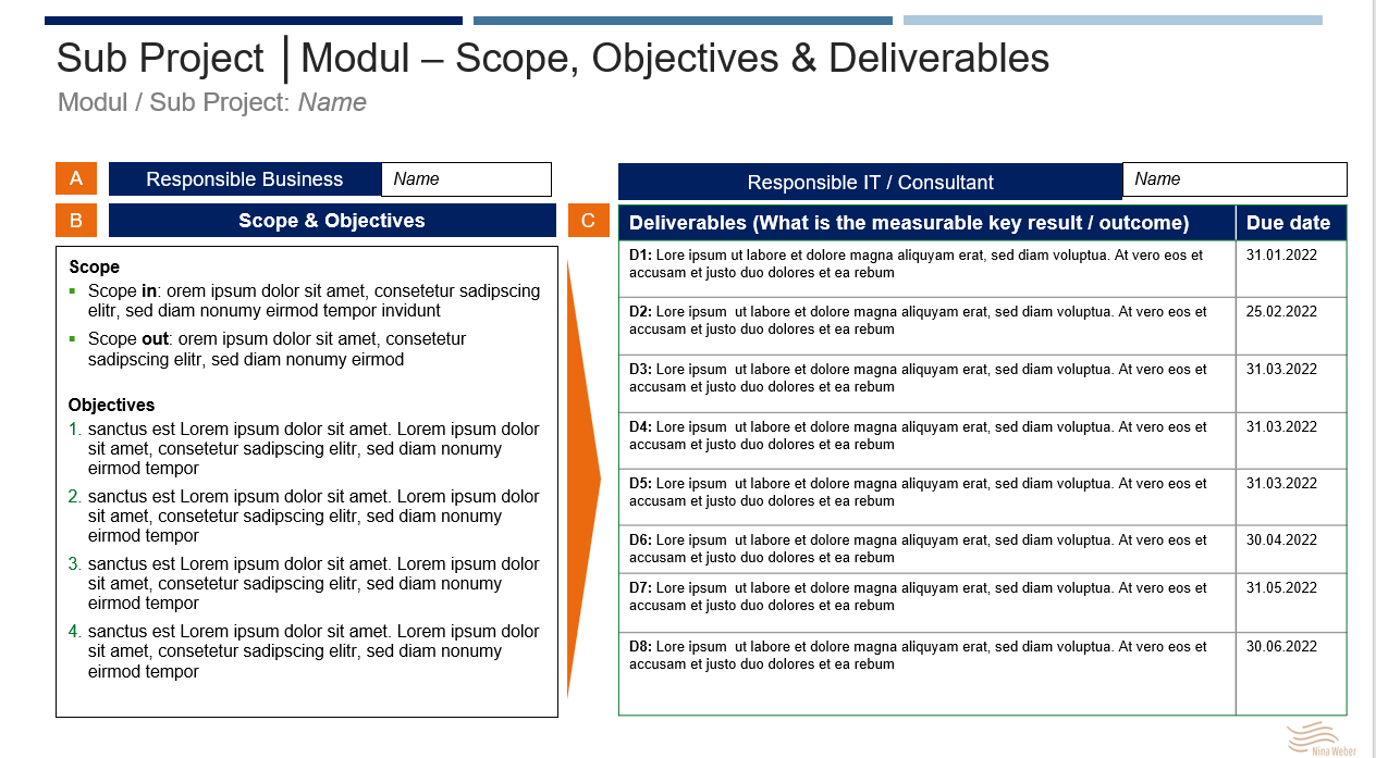 2 I Definition Arbeitspakete / Module / (Sub-) Projekte: Da ein Großprojekt in den meisten Fällen aus mehreren (Sub-) Projekten oder Modulen besteht, reicht die Erstellung eines Projekt Charters für das Gesamtprojekt nicht aus. Es ist darüber hinaus wichtig, zu Beginn des Projektes die einzelnen Projekt Module konkret zu definieren. Die Bestimmung des Leistungsbereichs ("scope-in/scope-out"), der Sub Projekt Ziele ("Objectives) und der dazugehörigen Leistungsergebnisse ("deliverables") sind zu definieren und zu terminieren, damit im späteren Projektverlauf das Modulcontrolling darauf aufsetzen kann.