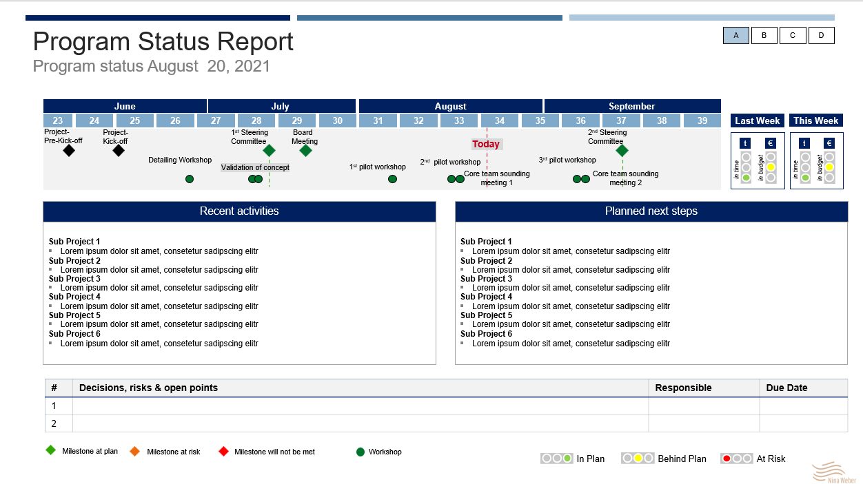7b_Projekt-/Programm Report Gesamt: Zur Steuerung der Projektarbeit ist ein differenzierter Projekt-/Programm Status notwendig. In wöchentlichen Jour Fixes ist es wichtig, die Terminplanung der laufenden 3-4 Monate und der in diesem Zeitpunkt relevanten Meilensteinen, Workshops und Gremientermine (Steuerkreis, Sounding Boards) im Überblick zu haben, diese im Team zu planen und vorzubereiten. Weiterhin ist ein detailliertes Monitoring der in der vergangenen Woche erfolgten und in der nächsten Woche geplanten Aktivitäten notwendig. Offene Punkte und Risiken werden offen angesprochen und Verantwortliche sowie eine Deadline für die Lösung der Themen definiert. Diese Statusübersicht bezieht sich auf das Gesamtprojekt.
